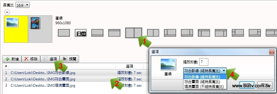 首先,在素材當中我們分類為影片類、圖片類、以及文字的顯示方式。每當您決定好了版型,開始進行加入檔案,並點選所需要調整的檔案進行以下選擇(可多選)。為了方便認得,例子當中我們放了三個相同檔案而名稱另取不同。