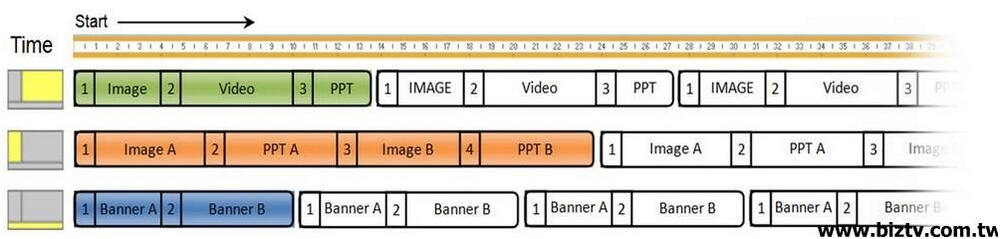 不論哪種數位看板,內容的顯示方式通常以一個單位時間內進行輪流播放。試著想像在畫面中被分割出多個媒體區域,您必須指定好每個區域要負責播送哪些媒體,同時在多筆媒體選擇下要如何安排順序出場。