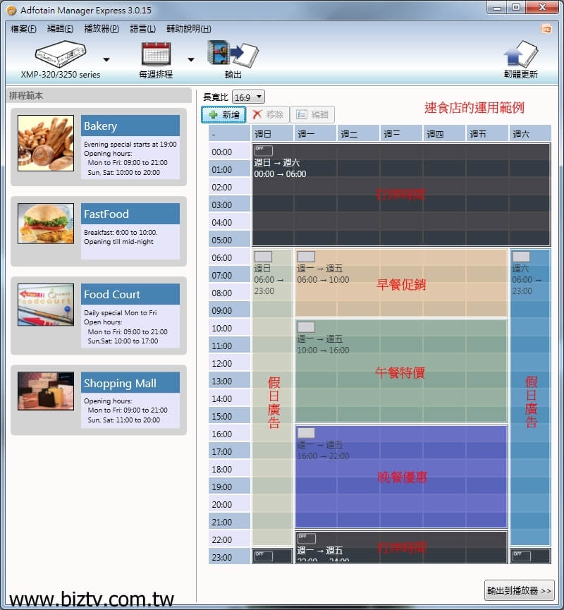 假設一個速食店業者,希望在每天早上6點到10點播放早餐內容,接著到下午5點播放午餐內容,而在打烊之前播送晚餐內容。這樣的需求條件為典型的在時間區段內安排多組循環播放,如圖所示: