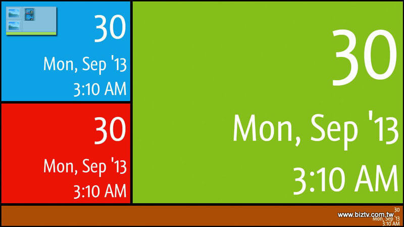 在Calendar的Widget項目之中,您可以挑選喜愛的色系來進行時鐘色彩效果。Calendar是根據廣告機的內部系統時間進行時區顯示,若您的時間出現不正確的時區結果請試著進入廣告機後台管理部分進行調整時區如UTC+8與系統日期。