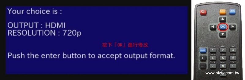 此時,請使用遙控器對廣告機按下『Output』點選適合的解析度與輸出選擇,這將調整廣告機最佳性能與輸出方式。如果您確定顯示器能支援1080p或720p卻沒有畫面,請試著對遙控器默按進行正確的輸出選擇。