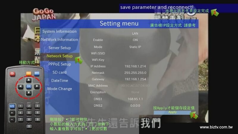▲透過遙控器在這裡輸入伺服器的IP,提供並告知廣告機連線到何處。記得按下Apply才成立