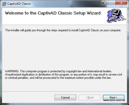 開啟光碟或下載Classic Setup軟體執行安裝,安裝時過程持續下一步即可完成。值得注意的是CaptivAD的版本隨著不斷求進會釋出新的版本所用,建議您安裝時以本站發布之新版本為主。若日後有版本升級需求時,請移除本軟體後再安裝即可(.net Framework與MS SQL 2005不需重新安裝設定)。重新安裝將不影響原本的內容與資料