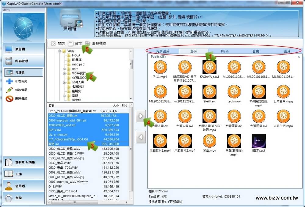 當您完成儲存動作時,伺服器會將您的檔案從電腦位置中進行上傳到媒體櫃。等待完成後,即可在後期的內容設計之中,進行素材擺放使用。而媒體櫃的可用空間大小,取決於您的伺服器(Server端)安裝目錄的儲存容量。因此,若您需要移除媒體櫃的素材來釋放多餘空間時,可透過以下步驟進行素材移除: