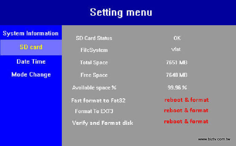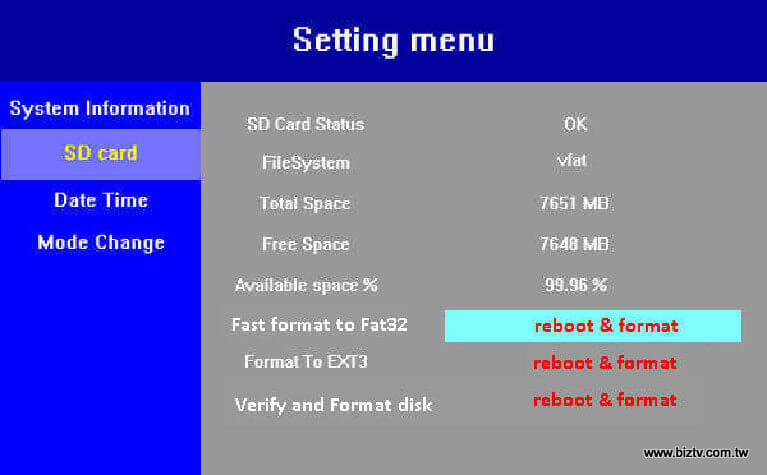 您可以自行升級SD容量,最高可達32GB以及Class 6等級。為了確保最佳效能,請更新為Ext3之磁碟格式為主。想要將SD卡格式化時,請使用您的遙控器開啟Menu 鈕,按向下鍵往下移動至SD Card項目,然後按右鍵移動到您想要做格式化的檔案系統設定(FAT32 / EXT3)上,按OK鍵後即開始執行以進行格式化。格式化時,所有媒體播放檔案將會清除,需注意。