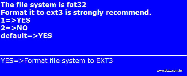 注意:當SD卡接上廣告機插槽後,如果SD卡的檔案系統為FAT32,而非EXT3,則自20110411版本後將在偵測到檔案系統為FAT32後,強制自動進行格式化為EXT3。如圖顯示: