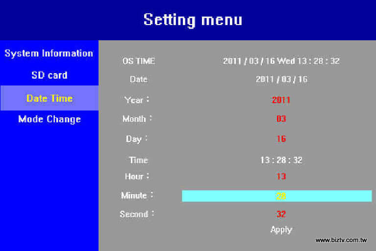 請使用您的遙控器按下Menu鈕,開啟Menu後,按向下鍵往下移動至Date Time項目,然後按右鍵移動到您想要變更的任一時間設定(年/月/日/時/分/秒) 欄位上,該欄位將用淡藍色框特別顯示,再按下OK鍵會將淡藍色框變為可編輯的黑色框。請注意:在變更完畢後,請記得按Apply以將設定執行生效。
