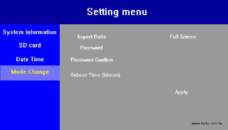 注意:如果使用者遺忘設定密碼,請移除SD卡,並對SD卡再進行格式化,格式化後,SD卡放回廣告機,廣告機重新啟動,將會重新設定密碼為預設密碼(空值,不需輸入