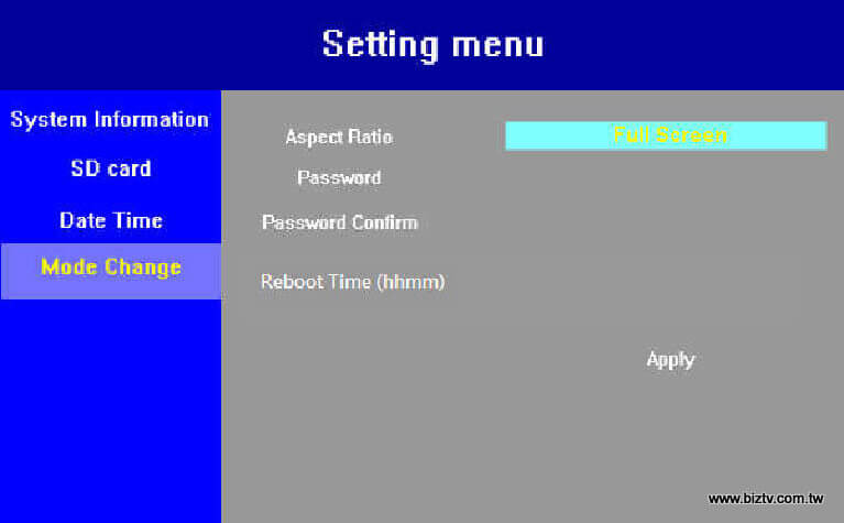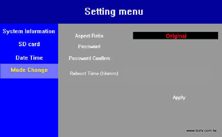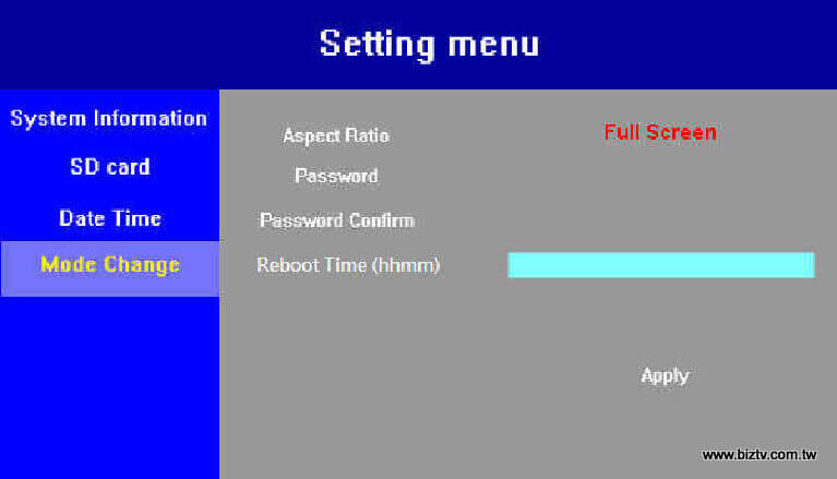 請使用遙控器按Menu鈕,按向下鍵往下移動至Mode Change項目,然後按右鍵移動到選單上,再按向下鍵往下移動到Reboot Time(hhmm),該欄位將用淡藍色框特別顯示,再按OK鍵會將淡藍色框變為可編輯狀態的黑色框,輸入的格式為hhmm,本欄位可設定每日重開機時間(Daily Reboot Time)。請注意:在輸入完畢後,請記得按Apply以將設定執行生效。