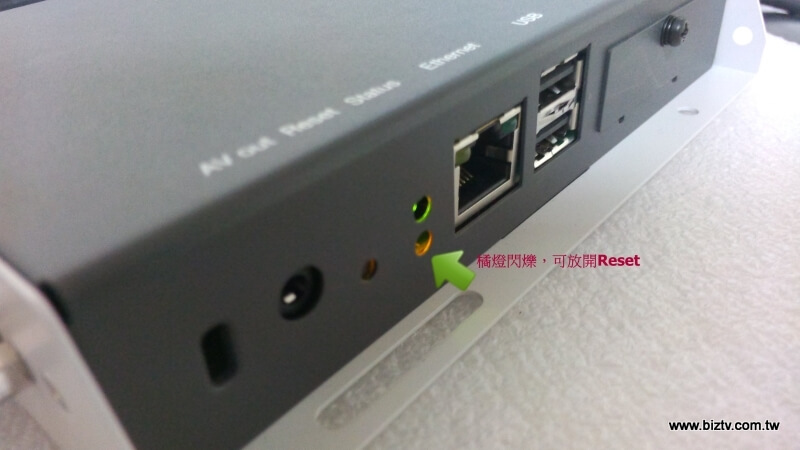 ▲等到電源指示燈(橘色)出現閃爍動作。可放開Reset鍵