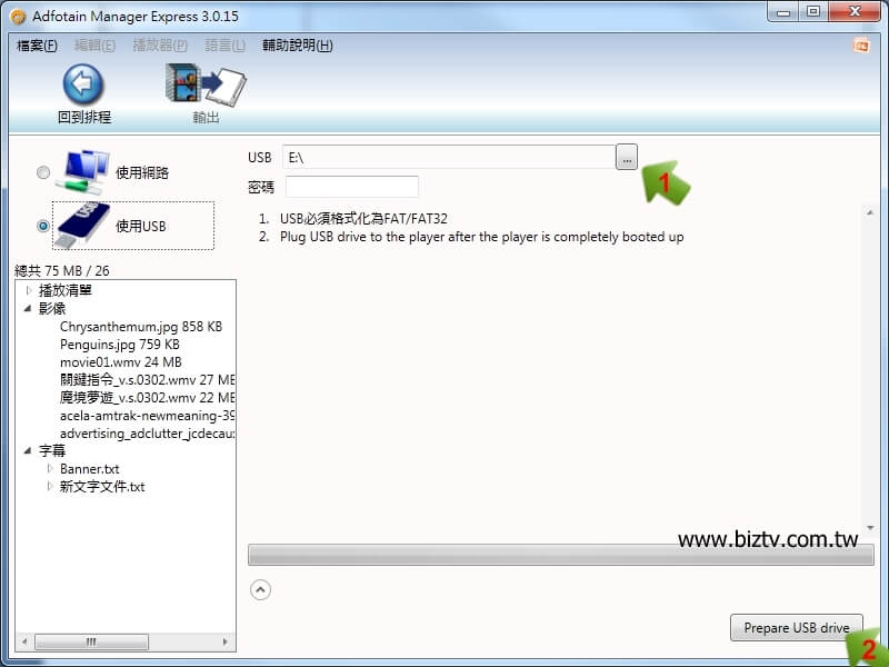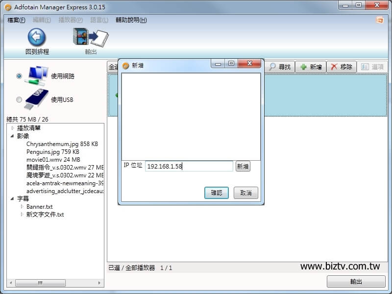 此時,透過畫面上的提示分為『使用網路』與『使用USB』兩種方法,使用網路的做法為在電腦端與廣告機端之間透過內部網路進行輸出,採用IP進行連線發佈。而USB的做法為在沒有網路的環境下,暫借USB外部儲存裝置進行輸出暫存,這需要先將USB置入於電腦端進行暫存後,以人工方式將同一隻USB置入到廣告機(看板顯示機),達到資料輸出的傳送行為。