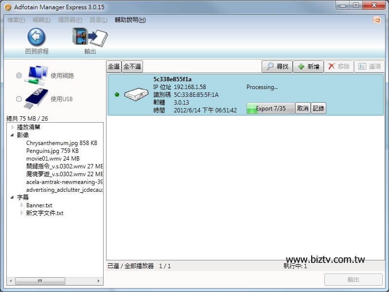 當您已經完成了Adfotain Manager Express的設計排程階段,接下來將必須將這個規劃內容輸出給廣告機(看板顯示機)所用。輸出方式為兩種分別為連線派送(網路)與USB派送(人工),本篇將說明兩種方式進行示範。