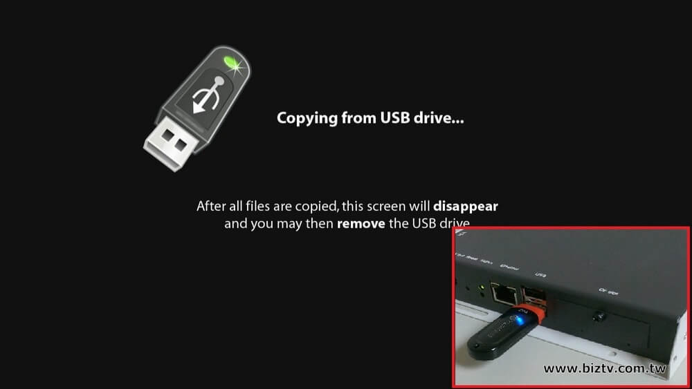 ▲會發現USB碟內SMIL資料夾與config.xml後,放置到播放器上開始提示下載 (請勿移除USB)