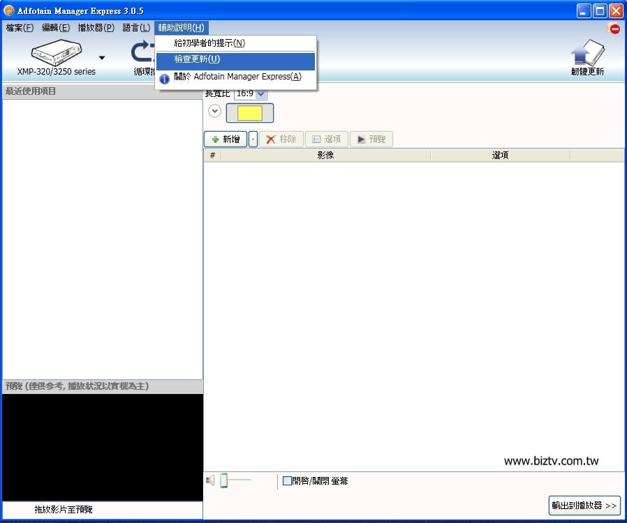 若您已經安裝完畢或已經開始使用Adfotain Manager Express,請定時檢查是否有新版本可進行更新(非必要)。若您需要更新時,請確保您的電腦具備可上網之網路環境進行遠端服務升級: