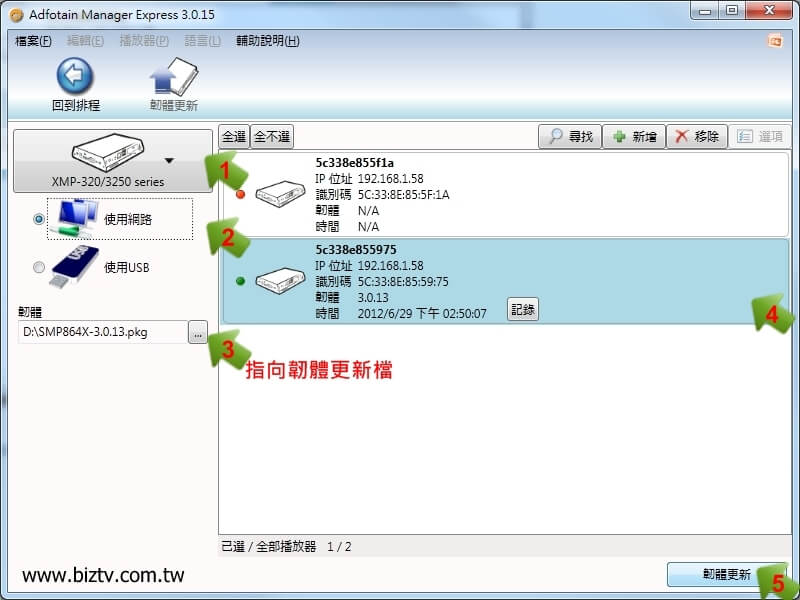 - 點選『使用網路』,點選可連線的機器,按下韌體更新。此時請勿停止關閉Manager Express運作,並等待完成。