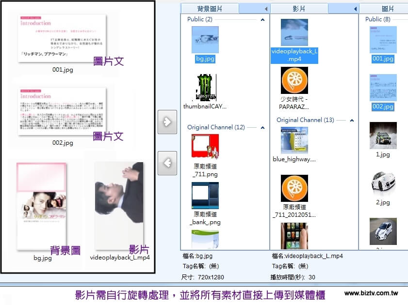 ▲先將所有素材上傳,而影片需另外自行轉檔處理(旋轉)