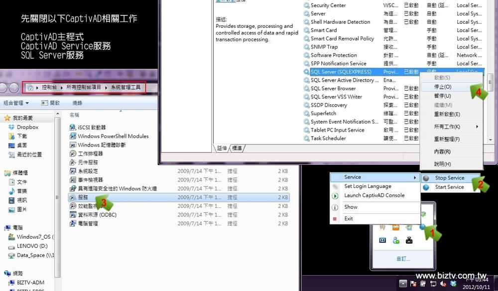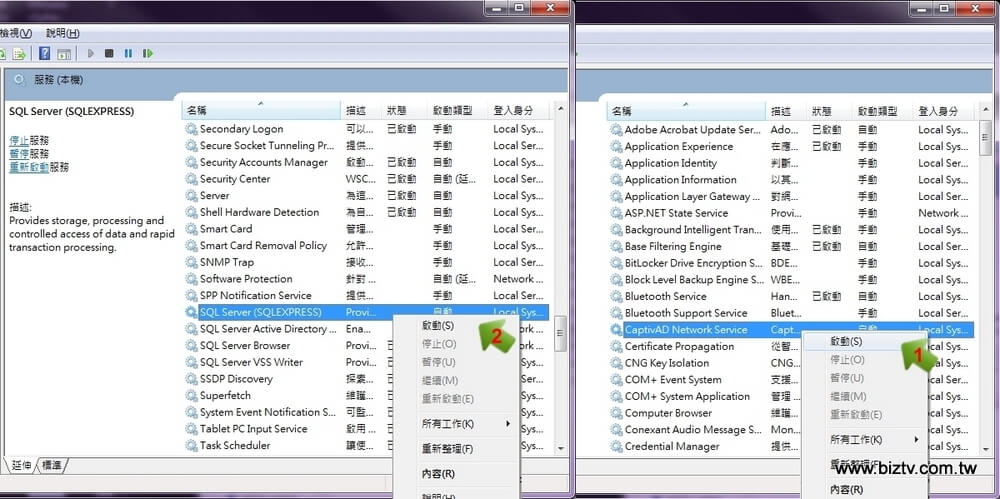 - 回到控制台->系統管理工具->服務,啟動SQL Express服務與CaptivAD服務