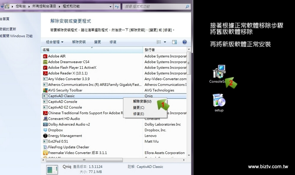 - 移置到控制台->新增移除程式,移除CaptivAD,並重新安裝新版CaptivAD