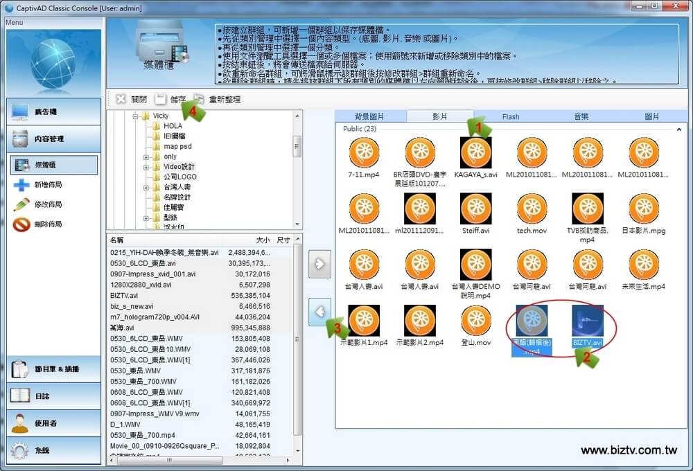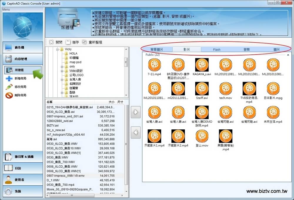 因而在設計廣告機的畫面之前,須先將所有會用到的媒體素材,在媒體櫃上進行做上傳動作。上傳方式的做法可參考以下步驟: