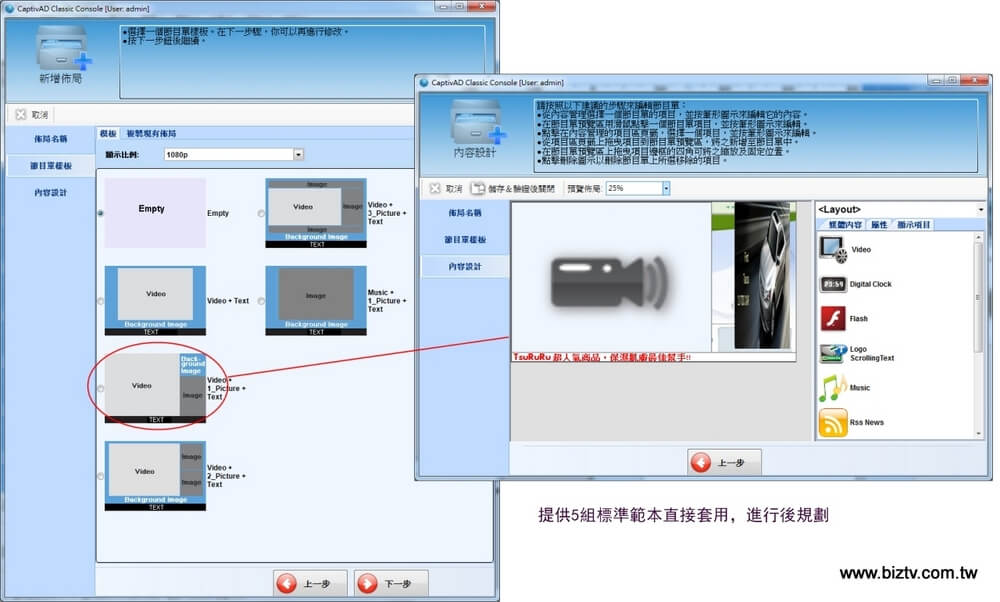 - 影片區(Video) -屬於動態主區域,除了可放置影片,也能穿插圖片、Flash做為素材共用此主區域做連續輪播。