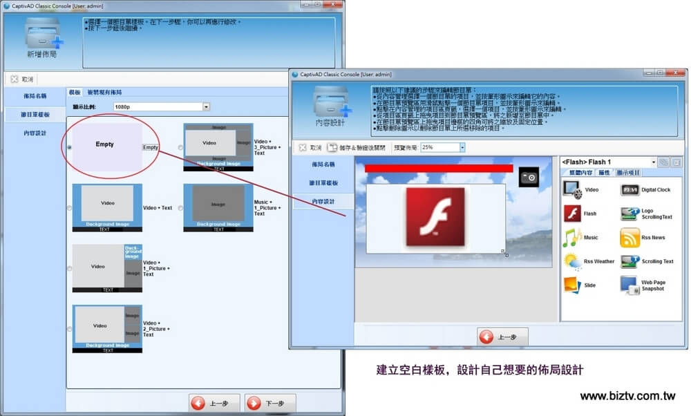 - Flash區域(Flash) -可顯示Flash的素材,通常可幫助在美化效果,或使用於XML資訊連網整合。