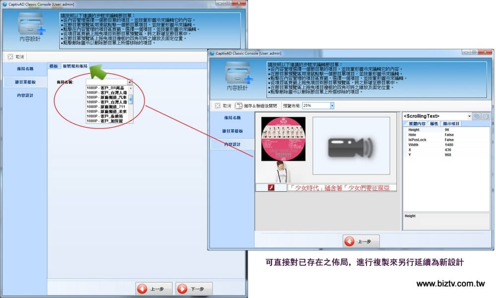 在佈局的內容設計當中,您能善用所提供的『顯示項目』來妥善規畫佈局。藉由預覽佈局的工作平台,來設定並拉取每一個框架的尺寸與位置。同時在所成立的區域之中安排素材做為放送。