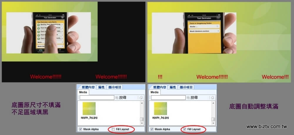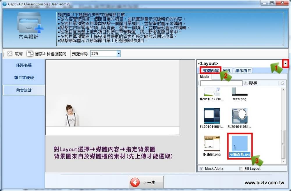 使用背景圖片用於顯示在所有框架的背後,做為一個佈局的唯一底圖。通常建議以1920x1080的圖片做高清背景。背景素材可以是BMP、EMF、GIF、JPG、JPEG、WMF等常見的圖片格式。在初始操作『內容設計』的空白畫面為Layout項目,需由右方的『媒體內容』來做底圖選擇,或透過下拉選單來選取Layout後來指定媒體內容。