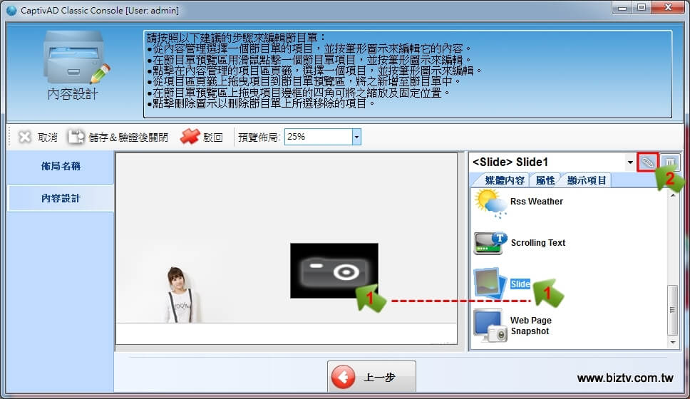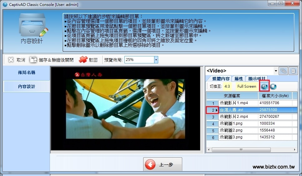 在編輯影片內容時,您可以從媒體櫃選擇出被許可的素材類型做為輪播內容,透過箭頭來增加或移除到播放的列表之中,並可對這些素材調整先後順序或預覽,最後按下完成即可。
