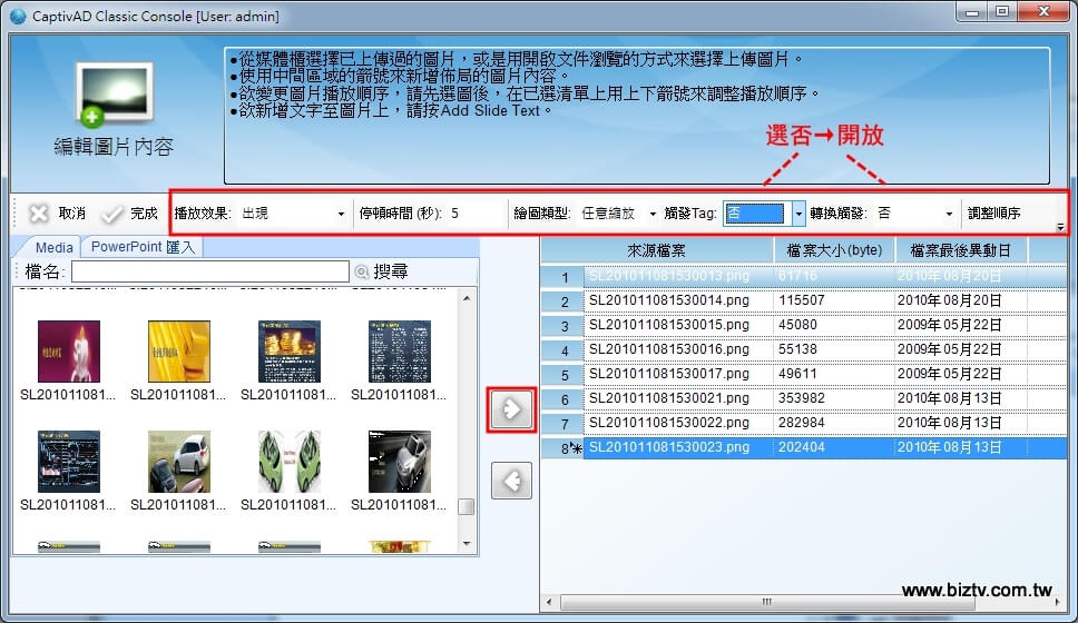 ▲圖片區能提供以上的編輯設定,透過箭頭將媒體櫃之檔案做排入動作