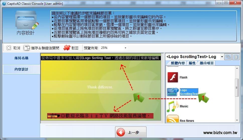 在設定的過程中,Logo Scrlling Text 最後會被CaptivAD生成為圖片供給廣告機使用,因此顯示結果需要由人工方式拿捏,透過不斷的微調整來達到最佳顯示。這裡提供了設定上的步驟與技巧: