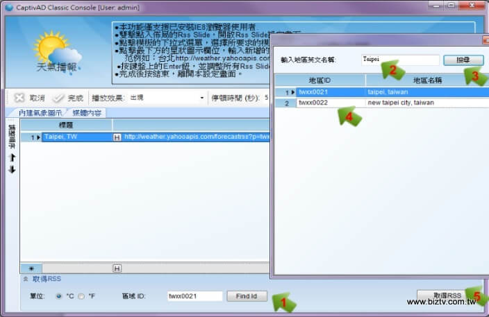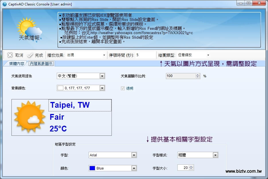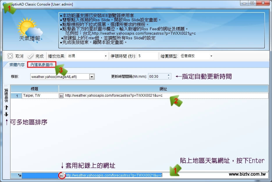 在媒體內容頁簽,設定Rss Weather的連結網址後按Enter鍵,系統自動帶出城市名稱,您可以設定播放效果、停留時間和繪圖選擇。如曾輸入過Rss Weather的連結網址,您可以按(H)圖示顯示過去紀錄使用的連結網址。