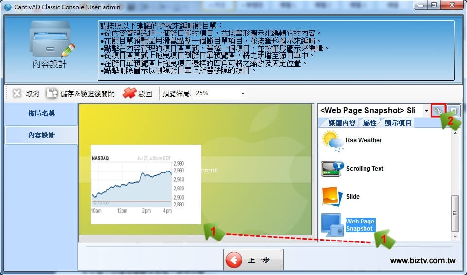 在佈局的內容設計當中,您能善用所提供的『顯示項目』來妥善規畫佈局。本篇僅適合有網頁管理與設計能力者使用,在介紹『顯示項目』中的RSS天氣、RSS資訊、網頁快照這三項之前,需告知您這些項目皆來自於現成網頁的資源做匯合使用,因此對於資料來源的穩定性與正確性將無法保證是否能長期使用。