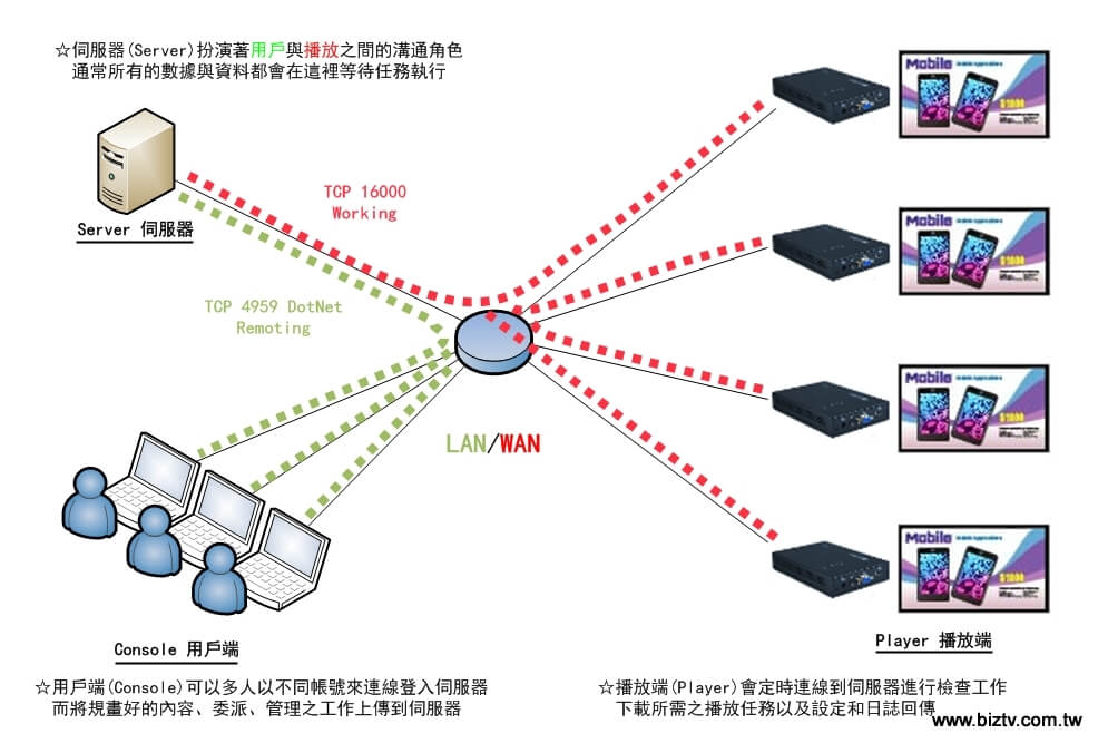 - 廣告機(Player):一個媒體放送的終端播放設備,另外還包括了一個可設定本體的控制遙控器。