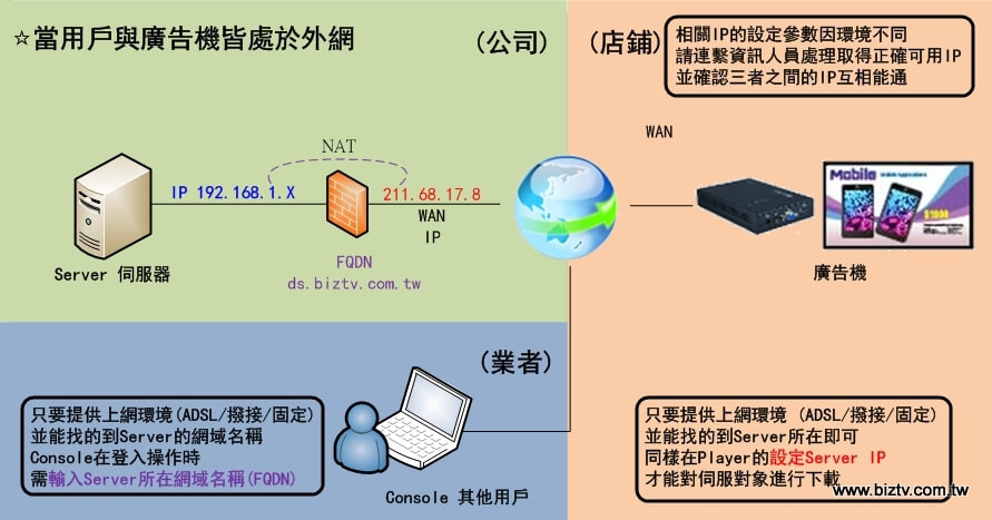 ▲將廣告機處於外網(區域網路+外部網路),適合需從公司來管理店鋪的多數廣告機