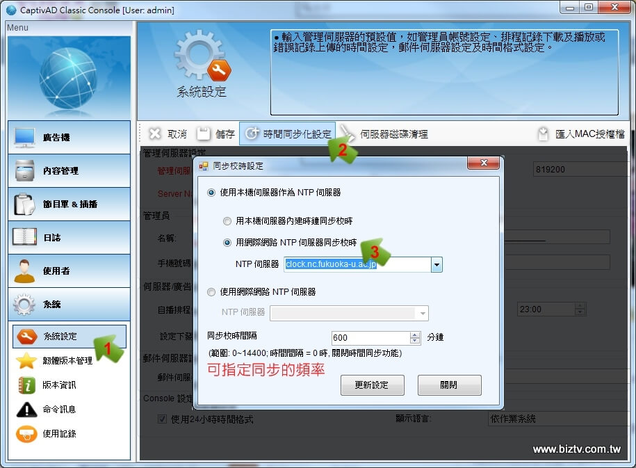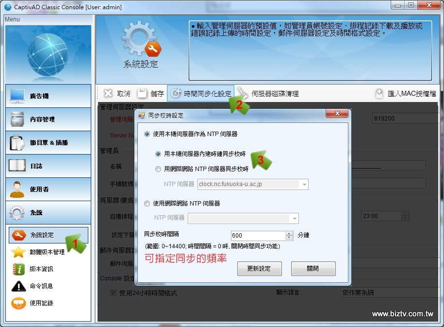 廣告機會自行上網連接NTP伺服器,進行同步作業。NTP是主要在提供網路上可以進行網路校時的主機服務。您可以自行輸入指定的NTP網路主機位置(Port 123),或者由軟體所提供的建議主機列表供選擇。使用NTP為時間同步時,請注意廣告機的網路環境是否允許連接該外網主機與防火牆Port 123。