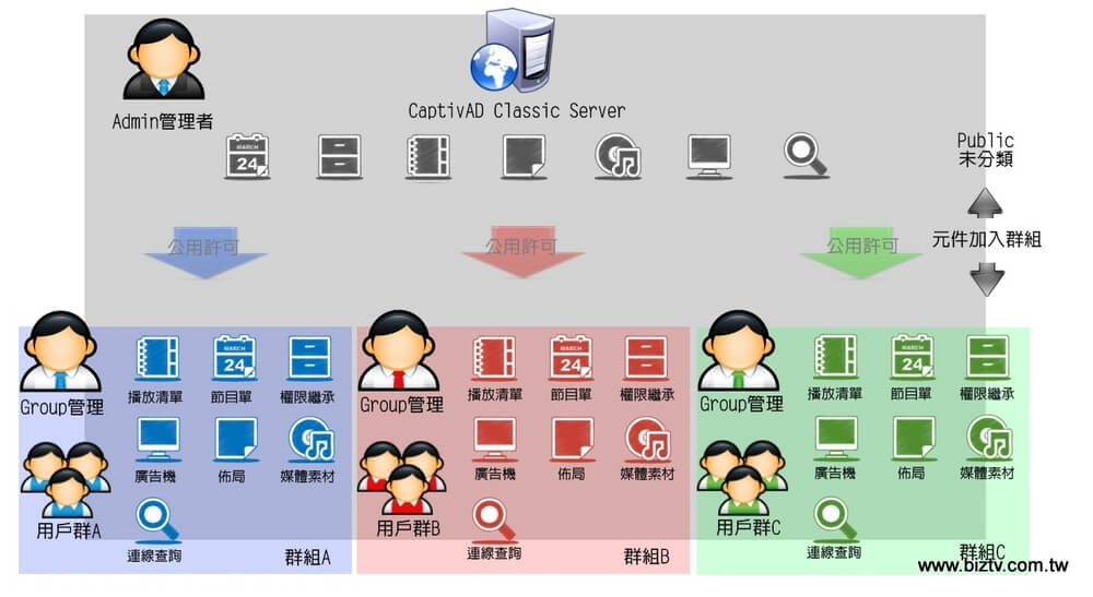 查看此篇之前,您需要先明白CaptivAD Classic的網路觀念以及多人帳戶的權限機制。本篇將指導您如何理解並使用群組化管理。這是一種可以將公用系統元件加以群組分類的組織獨立化,若您不需要多人帳戶或是群組分類,請忽視這項功能。
