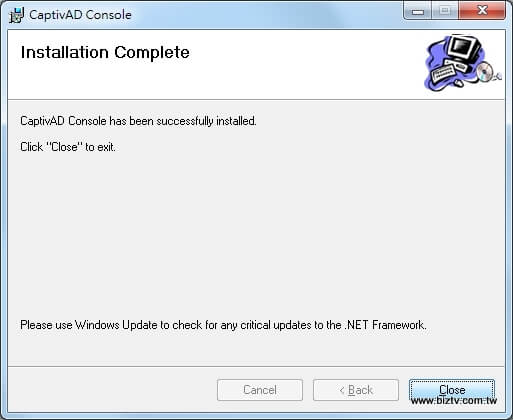 ▲一直安裝下一步即可並關閉Close,此時CaptivAD Console的安裝已完成