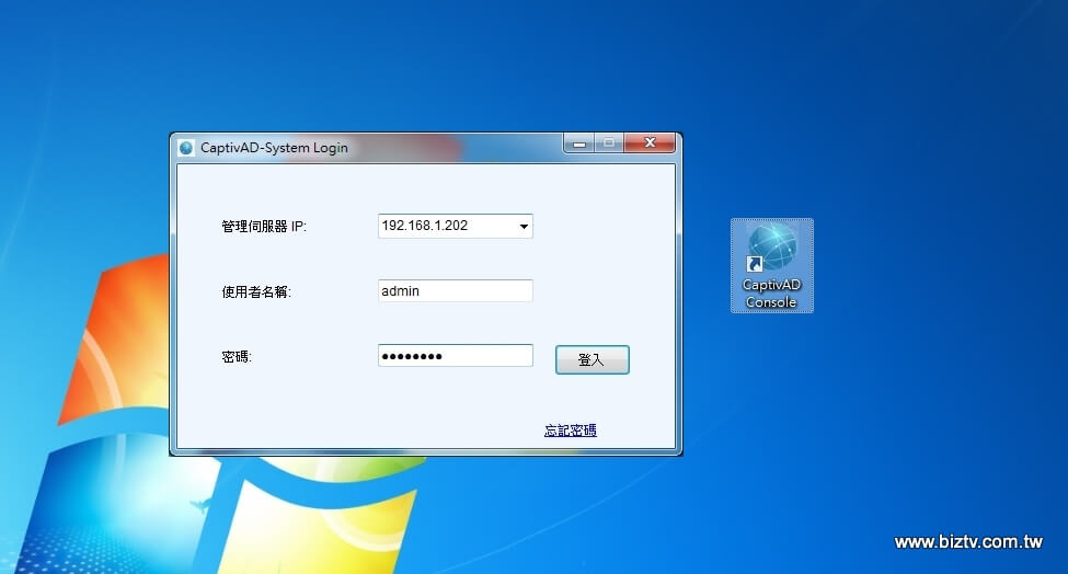 安裝完畢後,在桌面上出現CaptivAD Console的軟體捷徑,直接點擊後即可做為登入動作。請輸入您的伺服器IP位置以及所使用的帳戶作為登入。登入之後的操作將直接被寫入到遠端的伺服器內所使用,其操作方式與產品應用方式可參考論壇其他相關文件。
