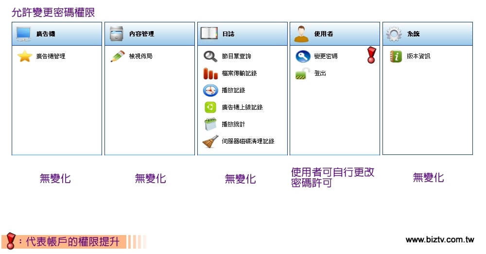 所有使用者都有以下基本預設權限,包含日誌查詢、檢視佈局、廣告機查看...等檢視權限。