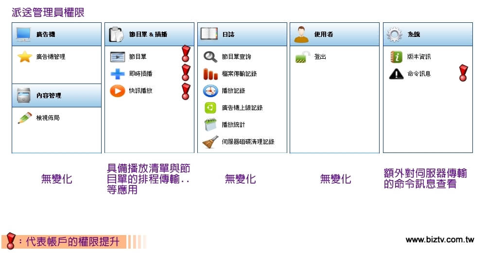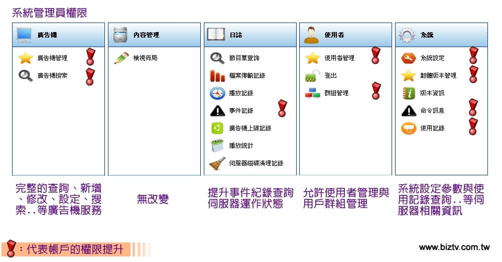 完整的伺服器系統管理角色,允許使用並調整所有的廣告機管理、使用者與群組管理分配、系統設定查詢...等主要核心管理權限。