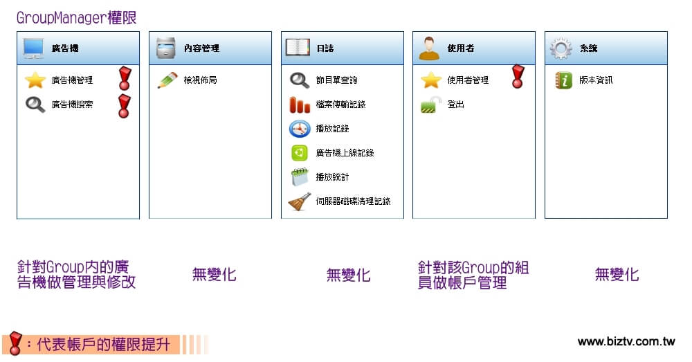 該群組下的主管理員,差別於系統管理員角色,只能管理屬於該群組下的廣告機管理與使用者管理。