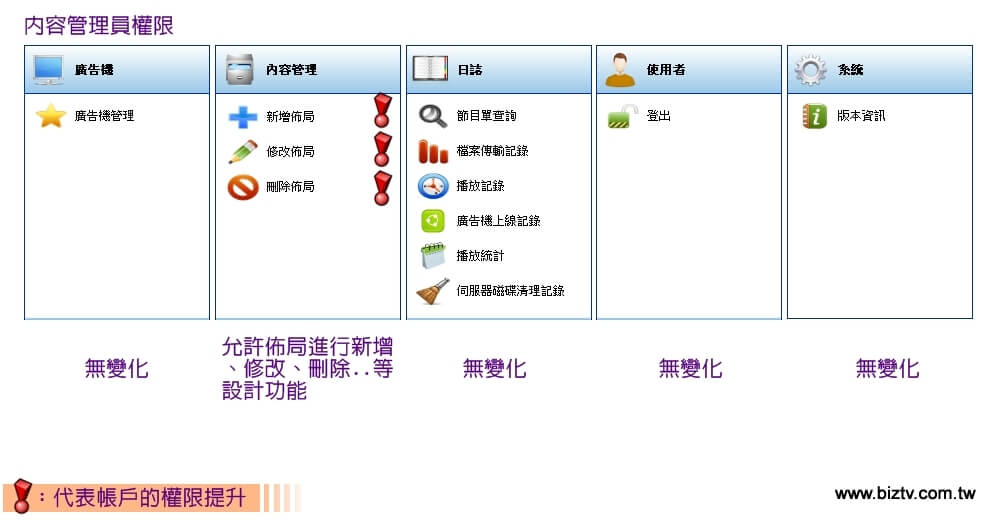您可以想像,提供部分權限給美編做上傳編輯,由企劃來審核允許發布,最後由工程來排程規劃...等,將設計、排程、傳輸這流程步驟完整拆解許可使用,做為流程上的組織分工管理。 當然若您沒有組織性的多人管理需求,且不需要第二個以上的帳戶來協助管理。建議可以忽略此篇介紹,直接以admin一個身分進行完整操作即可。在初始作業環境下,系統預設的系統管理員身分擁有完整的功能使用權限。