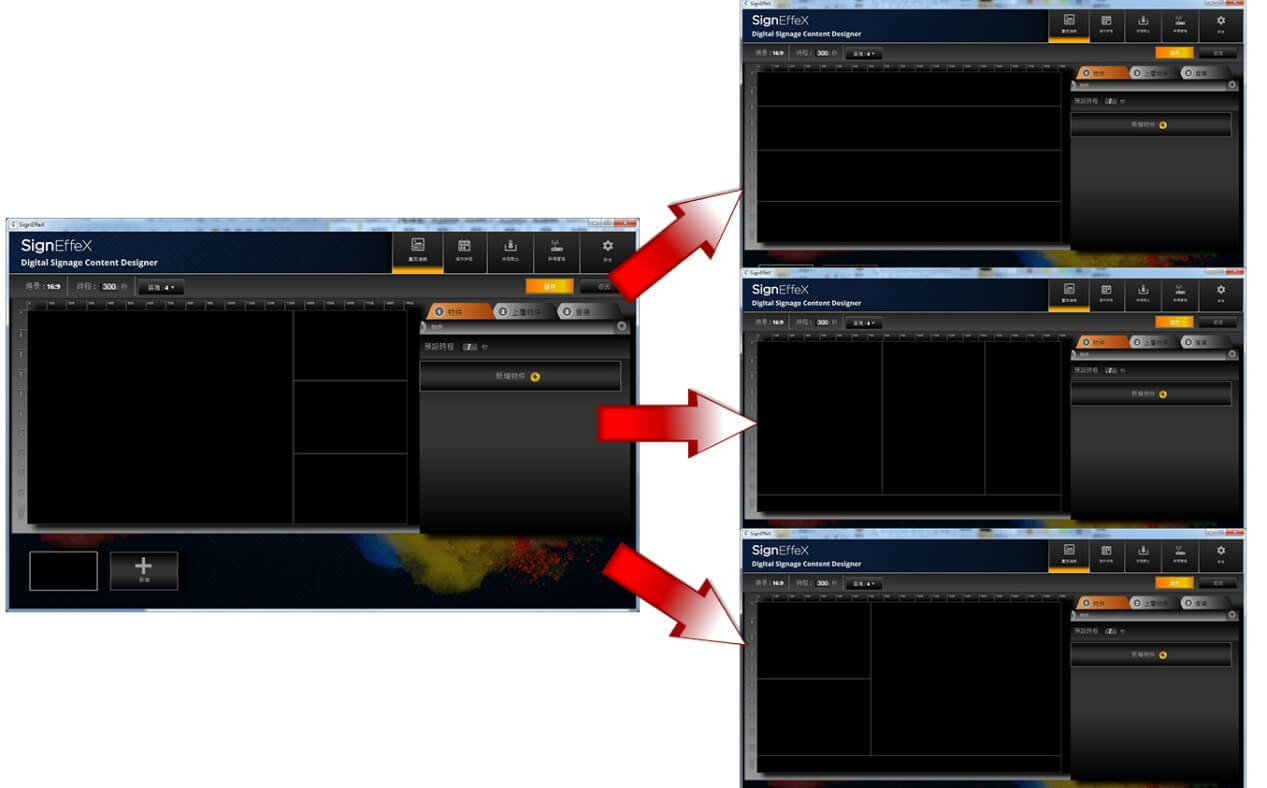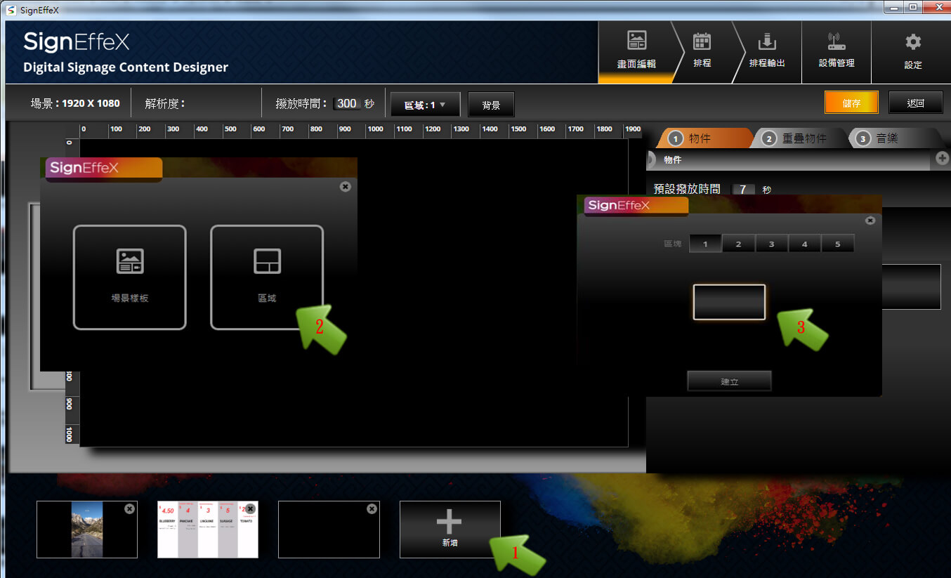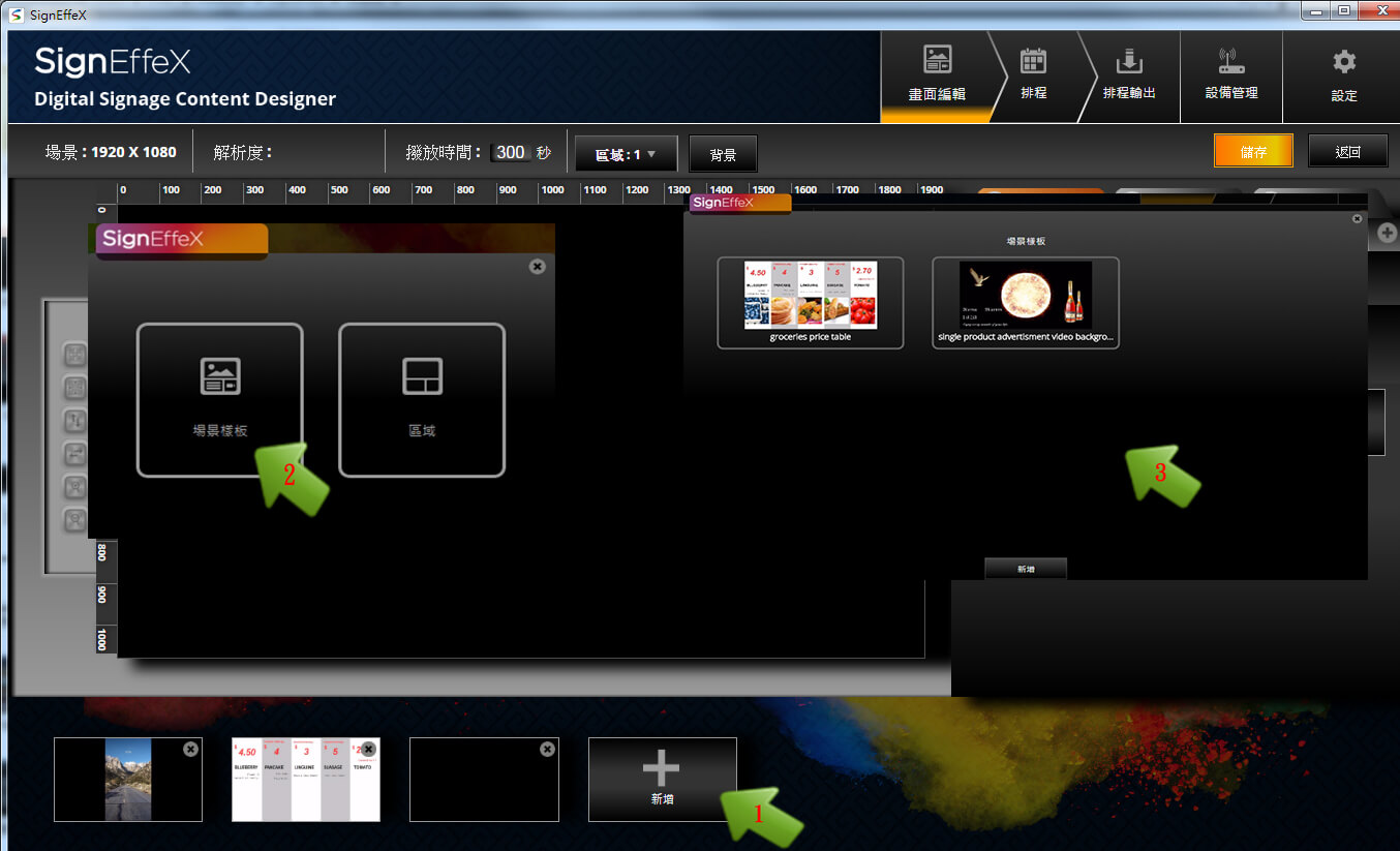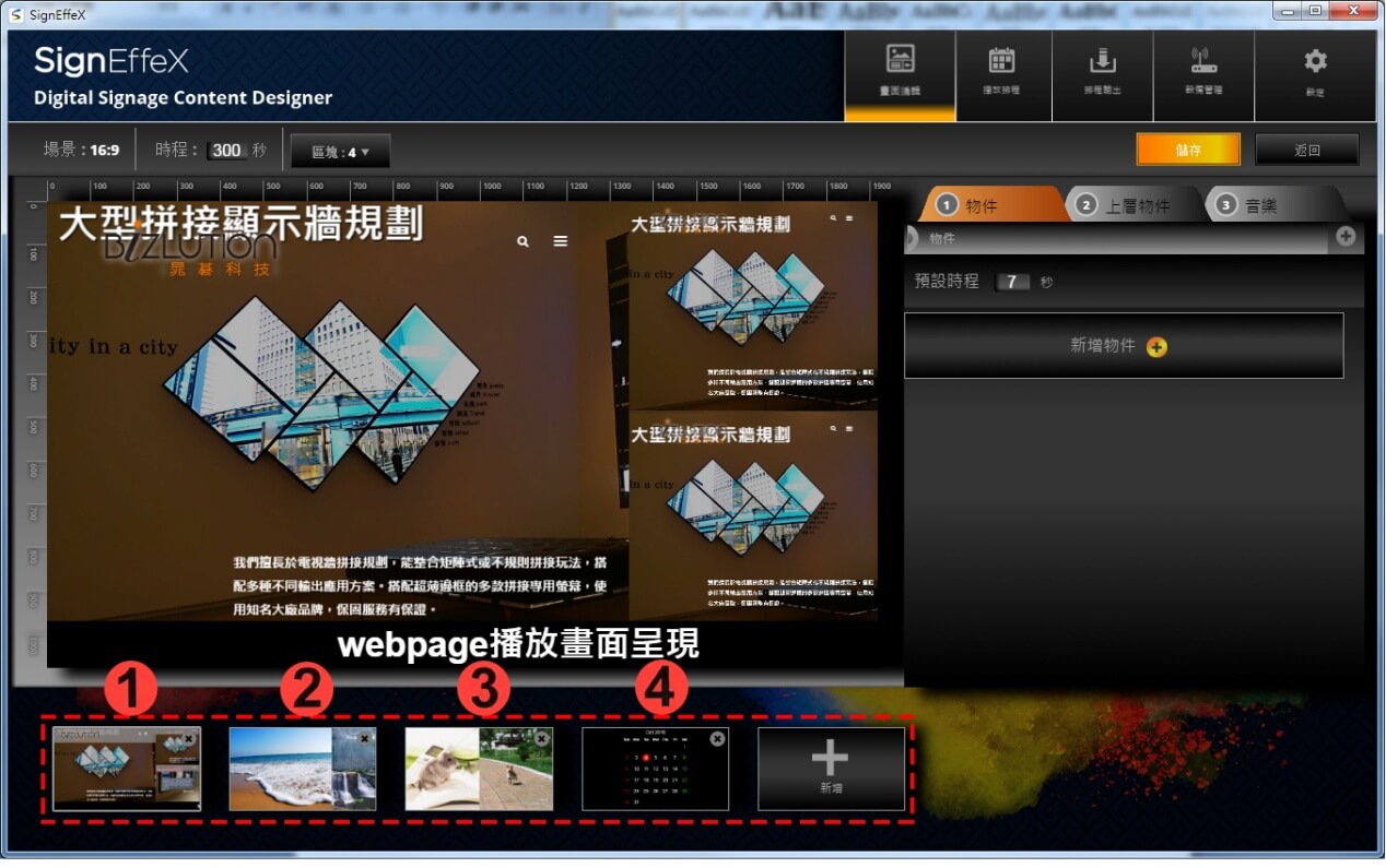 我們用個簡單例子做示範,當第一個版型建立完成後,可再陸續增加不同的版型區塊進行編排,接著再定義每個版型所要停留的顯示秒數。