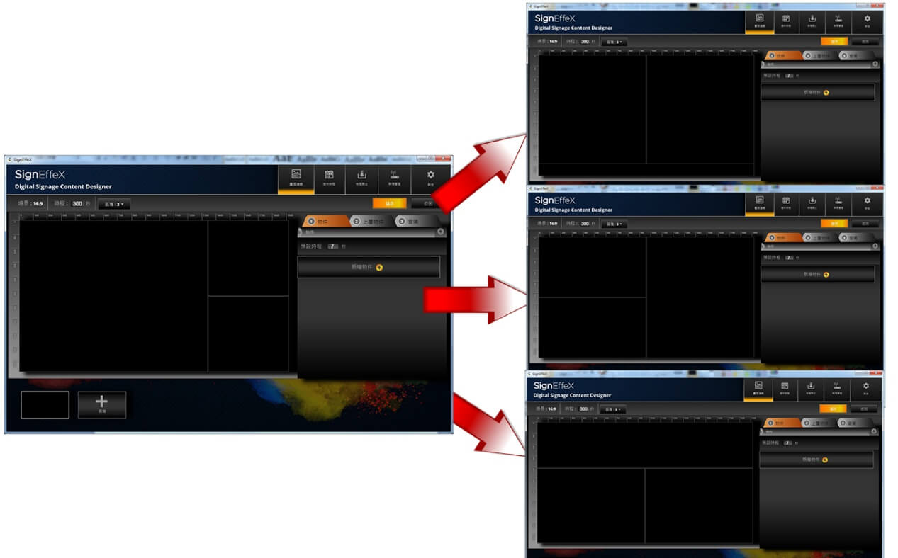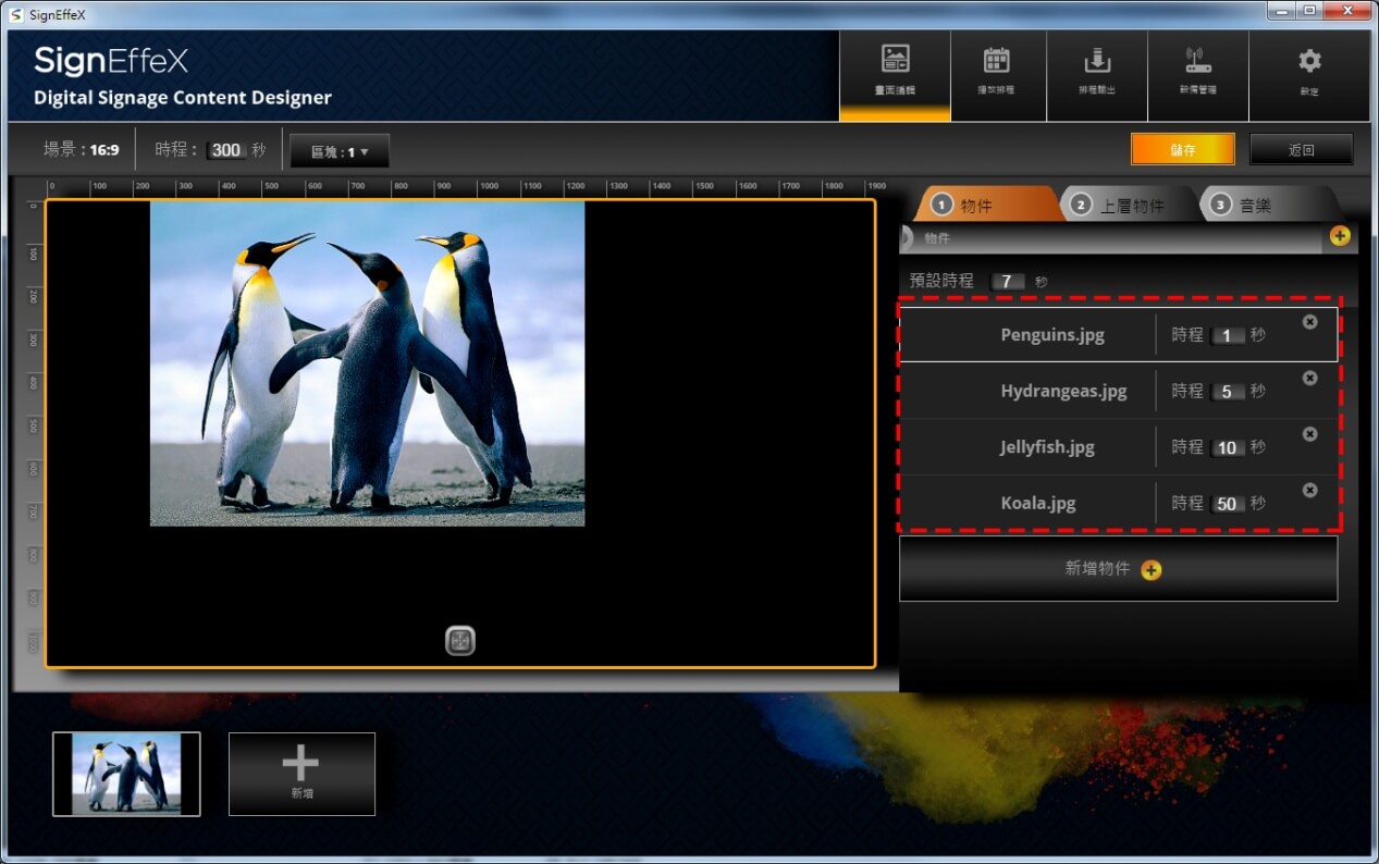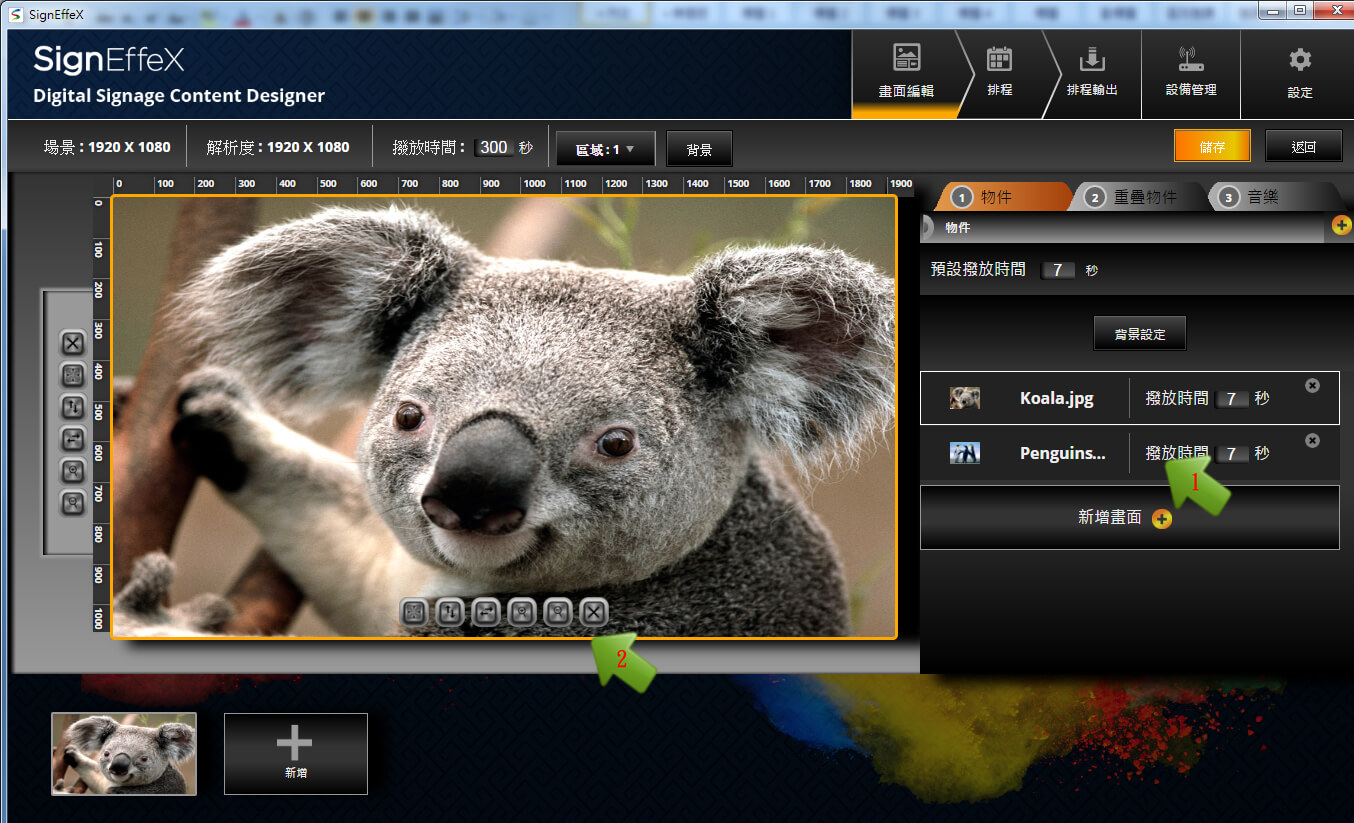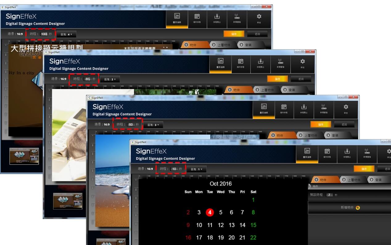 我們用個簡單例子做示範,當第一個版型建立完成後,可再陸續增加不同的版型區塊進行編排,接著再定義每個版型所要停留的顯示秒數。