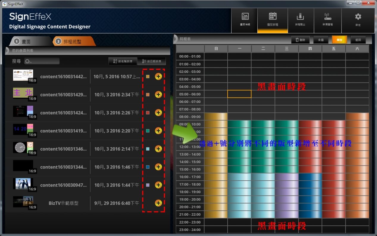換言之,你可以設計出週日至周六各自不同的節目內容。在時間裡安排您需要播放的版型。而如何建立一個時段播放,可透過+號新增來建立需要的播放版型,每一個彩色方塊代表著一個獨立的版型播放。每個彩色方塊可獨立且彼此擁有不同內容。