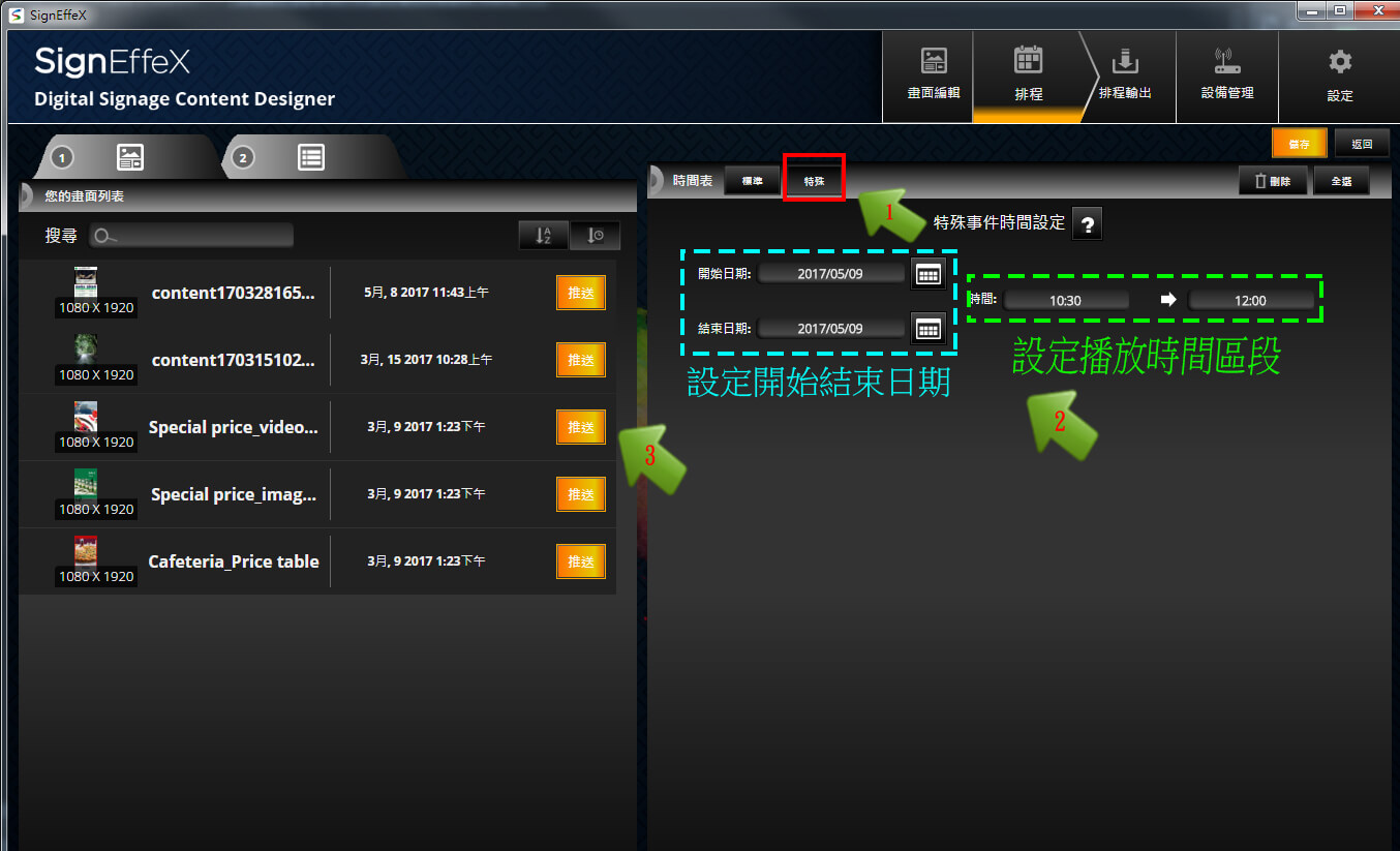 如果已經建立好一個基本的排程,但又想在某個特定時間或節日播放一個特別的畫面而不破壞既定的基本排程,這時您就需要特殊事件排程設定來達到一個指定日期、時間甚至是週期播放。而當特殊事件被建立後,其播放順序是高於標準排程的,因此需要特別注意。