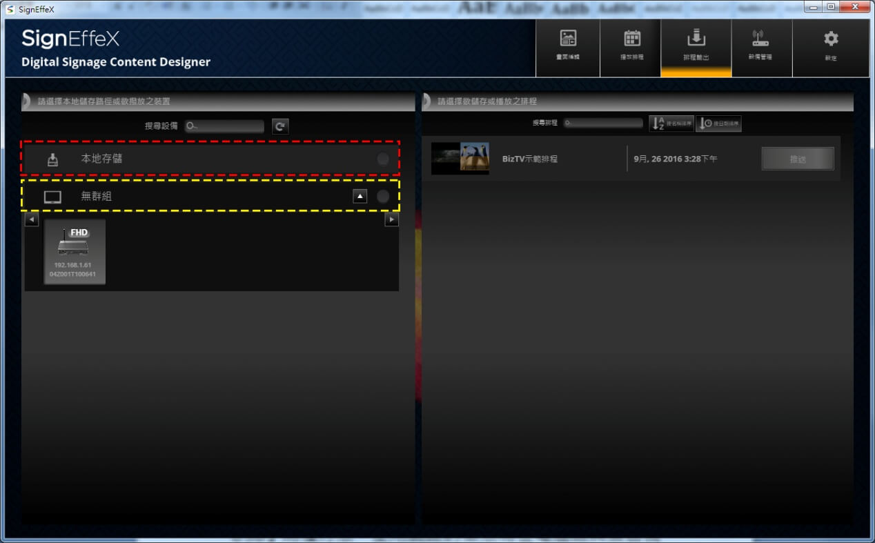 當您進入『排程輸出』已經能看到播放器連線狀態就代表您已正確的搜尋到區網IP或是登入網路帳號,如果並未看到任何播放器狀態,請至4-1設備管理與群組設定章節,將會有更詳細的介紹。