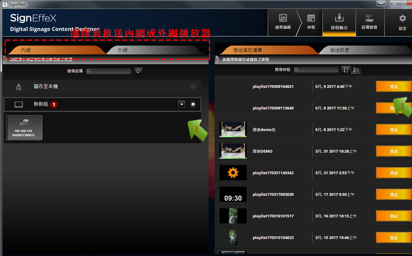 ▲將滑鼠點選好要更新的播放器(可多選),選擇要更新的排程內容項目後點選『推送』