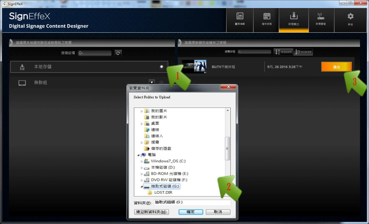 透過畫面上的提示分為『群組網路派送』與『本地存儲』兩種方法,使用網路的做法為在電腦端與廣告機端之間透過內部網路進行輸出,採用IP進行連線發佈。而USB的做法為在沒有網路的環境下,暫借USB外部儲存裝置進行輸出暫存,這需要先將USB置入於電腦端進行暫存後,以人工方式將同一隻USB置入到廣告機(看板顯示機),達到資料輸出的傳送行為。