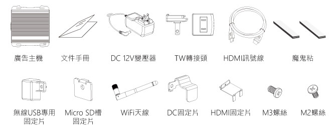 SignEffeX 系統能支援相關商品包含播放器FHD-100,請檢查您購買的商品是否包含以下配件,如果缺件請聯繫您的購買來源或供應商。